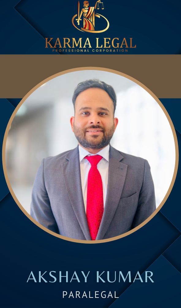 Akshay holds a Paralegal Diploma from CIMT College, Brampton, and is dedicated to providing client-centered legal support with professionalism and integrity. His strong organizational skills, attention to detail, and commitment to confidentiality ensure high-quality representation. At Karma Legal Professional Corporation, Akshay is passionate about assisting clients with their legal needs and fostering positive outcomes.
